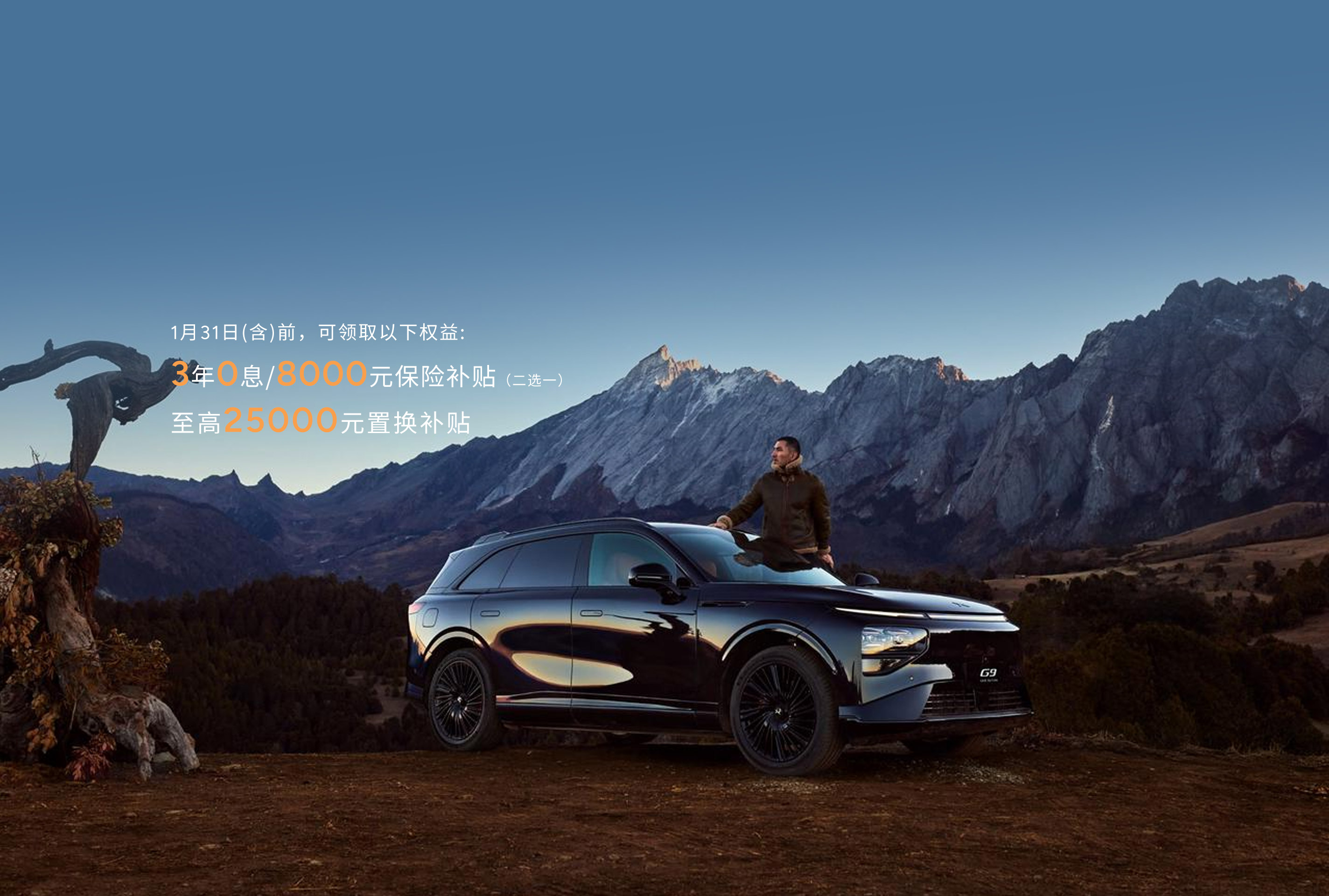 权益说明*:1、至高贴息金额是以2025款小鹏G9 680超长续航四躯 MAX全国建议零售价27.88万元、0首付、融资期限3年为基准,与同期非贴息产品2.49%年费率(近似折算年化利率4.73%【单利】)对比后测算得出。0首付对客户资质有一定要求,最终以小鹏汽车官方合作机购实际审批为准,具体机构及更多政策详询线下门店或登录小鹏汽车官网/APP/小程序查看。3年0息金融方案可替换为5年低息金融方案,3年0息金融方案、5年低息金融方案均与8000元保险补贴不可同时享受,详情可咨询当地销售门店。2、置换条件:(1)置换客户需满足条件新老车主是同一自然人/公户、股东/法人或直系亲属关系;(2)用于置换旧车需为非营运乘用车,且下定前原车主名下持有时间大于90天。置换权益兑现方式:经审核符合小鹏官方置换权益申请条件的客户,权益将在小鹏新车交付后发放(现金折扣除外),客户旧车需在新车交付前交由小鹏汽车官方指定渠道完成收购(如旧车符合报废车以旧换新条件,需在新车交付之前提交旧车报废相关材料),置换补贴,包含小鹏汽车不限品牌置换补贴5000元、国家以旧换新补贴2万元。其中,国家以旧换新补贴规则,具体详情以有关部门官方公告为准。上述涉及小鹏汽车购车政策与权益活动周期为2026年1月1日~2026年1月31日,以定金支付完成时间为准,详情请咨询当地小鹏汽车销售门店。*以上政策均不适用于2026年上市的新车。